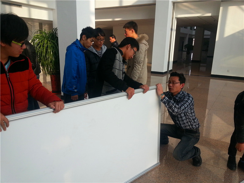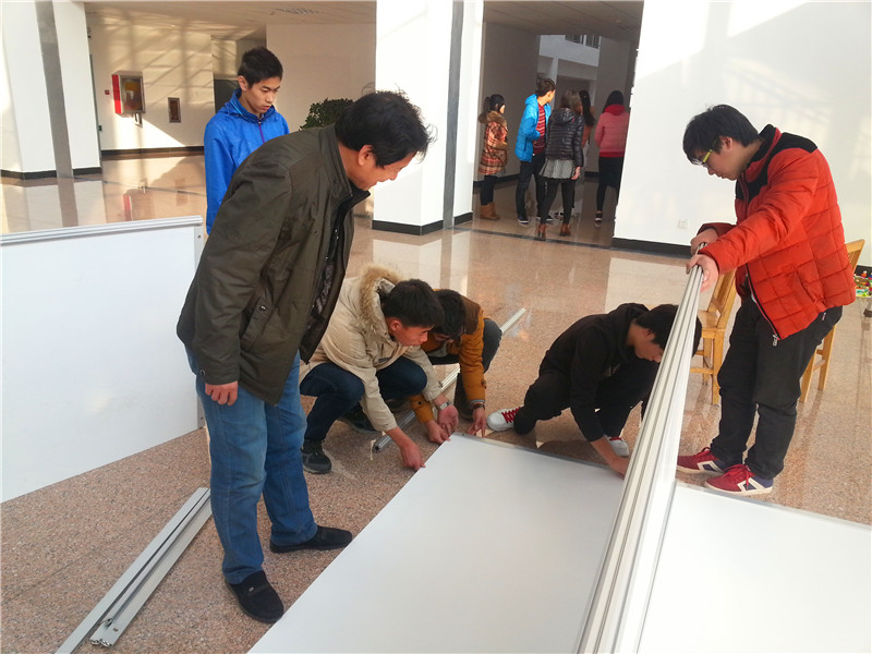 为了尽快完成所有作品的布展,师生们从中午12点就开始忙碌。由于是第一次接触这种展板,学生们缺少经验,一开始都摸不着头绪。老师们就把现场变成了课堂,指导学生们把展板与八棱柱先在地面上插接好,然后立起来按照不同的方向进行组装。展板太高,他们架起了梯子;紧固螺丝紧贴着地面,他们就跪在地上;位置不合适,大家一起小心翼翼地挪动。从展板组装到整体布局,在老师细致地指导和示范下,学生们表现出极高的热情和工作积极性,很快就掌握了技巧,开始熟练地组装。大家一直忙碌到晚上12点,终于圆满完成了全部作品的布展工作。
