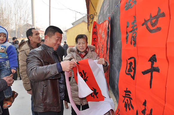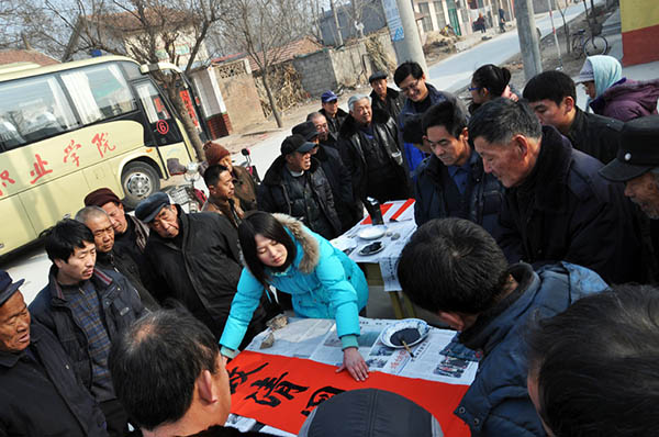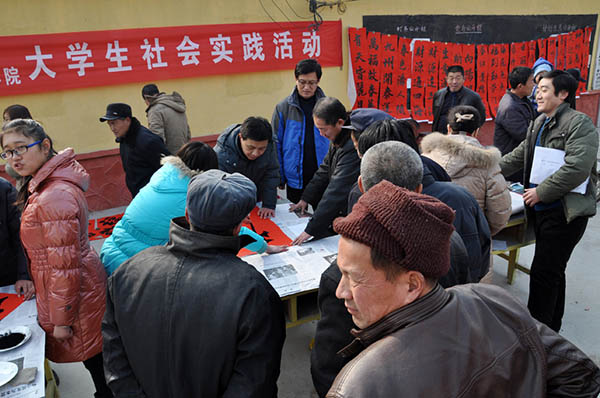 师生们冒着严寒,为当地老百姓现场书写春联100多幅,活动持续到下午1点多才结束。此次活动受到村民热烈欢迎,街办负责人及后郑二村书记代表村民对该院开展写春联活动表示感谢,希望今后该院进一步发挥专业优势,对新农村文化建设给予支持和帮助。