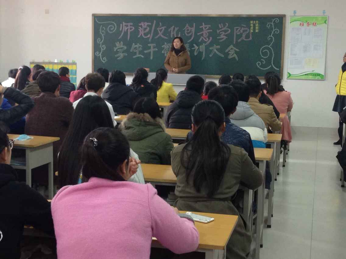 为进一步提高学生干部队伍的综合素质,充分发挥学生干部的模范带头作用,更好的服务学院、服务同学,师范/文化创意学院于11月12日中午在惠泽1号楼B412召开了学生干部培训大会。