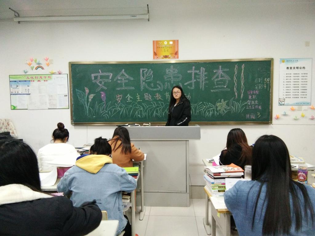 为进一步强化学生安全管理工作,预防校园安全事故,维护校园安全稳定,3月26日,文化创意学院举行安全隐患排查和安全教育主题班会活动。 此次活动,主要讲解了关于进一步加强学生遵规守纪教育、加强学生用电安全和防火意识的教育、加强学生人身安全教育、加强学生餐饮安全教育、加强学生网络安全教育等内容。强化了学生的安全认识,提高了学生的思想认知。 为了我们校园的和谐,让我们积极行动起来,为校园的安全撑起一片天空。人人事事保安全,关键要从我做起,从现在做起,从点滴做起!