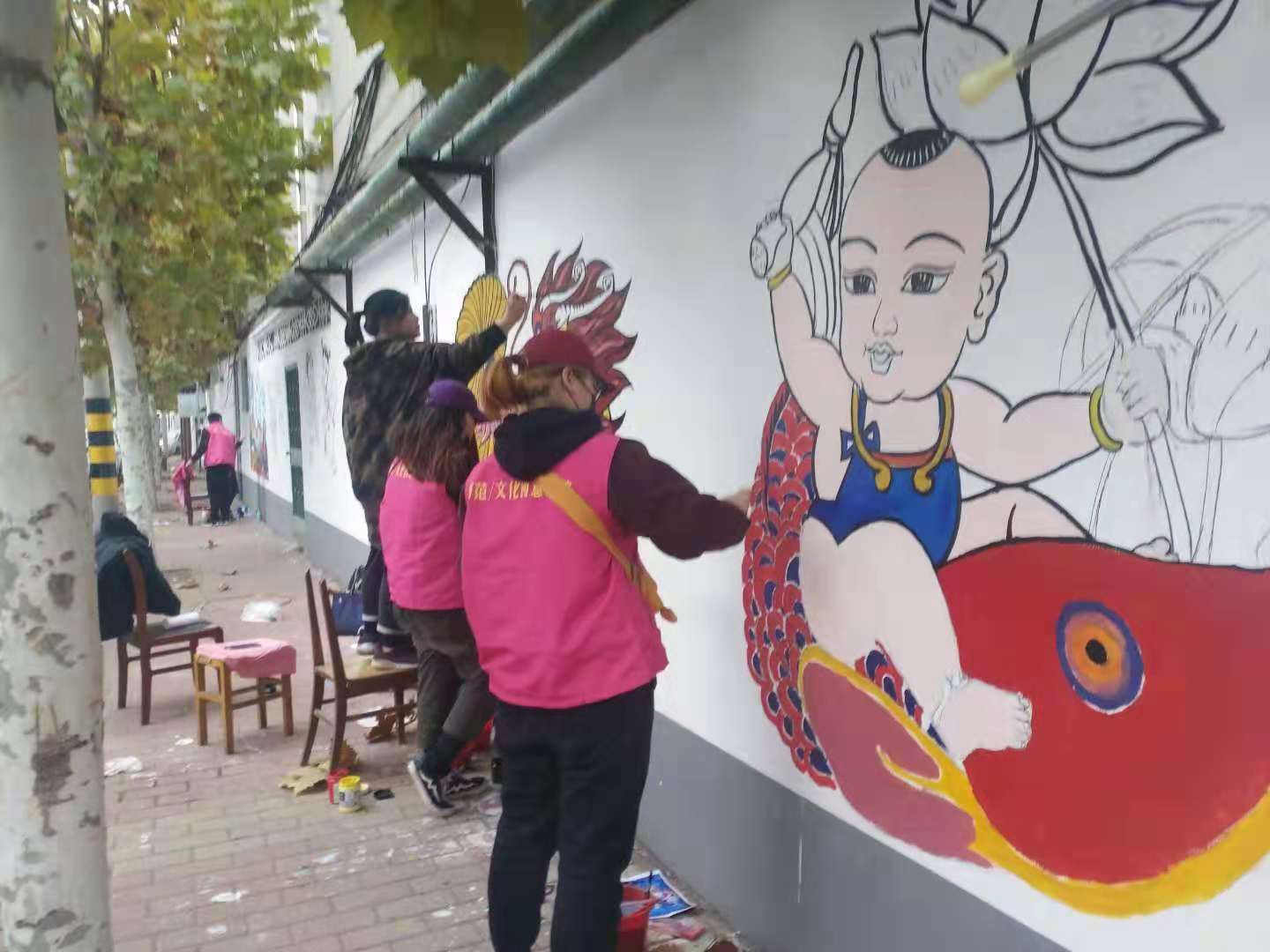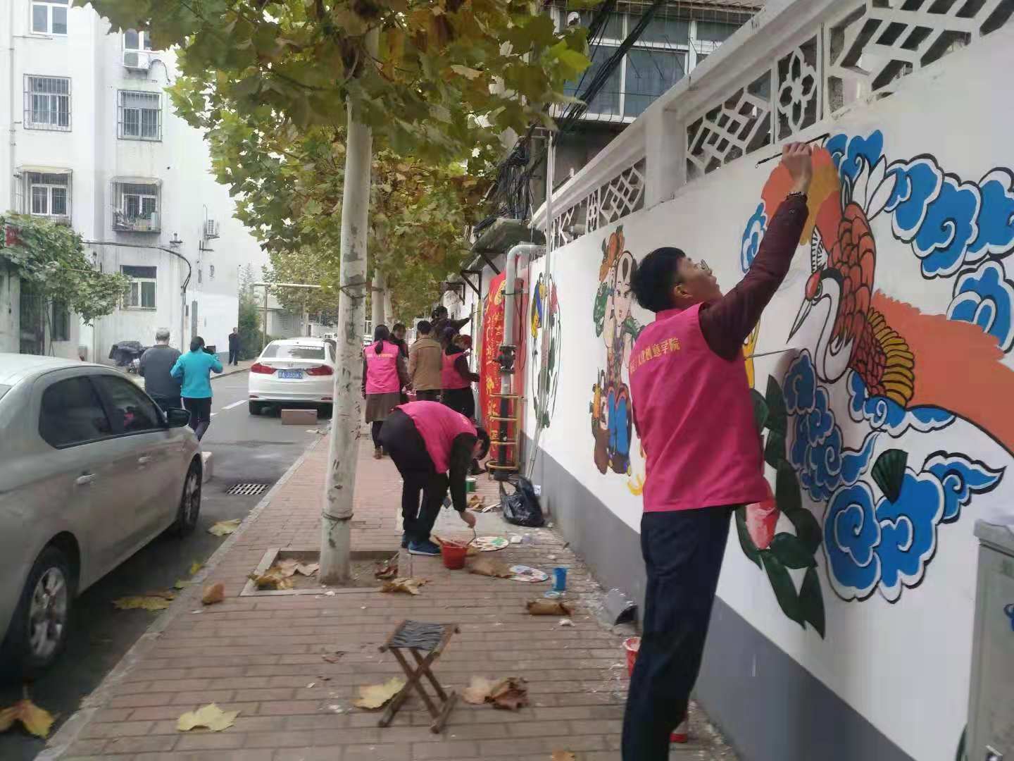 绘制期间,师生早出晚归,克服天气寒冷,认真绘制,在三百五十米长、两米五高的围墙上完成了“记住乡愁,守望精神家园——我的老潍县街巷,记忆、传承、创新”系列彩色墙绘作品,内容包含潍坊风筝、年画、老街及各种乡邻风俗画等。
