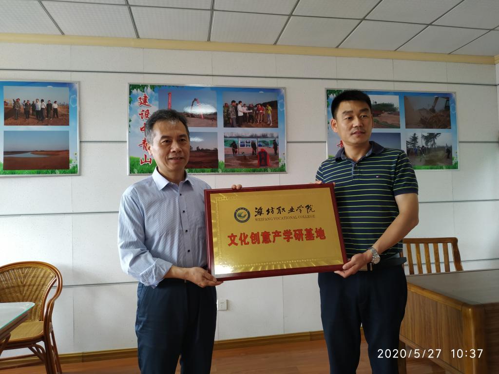 双方本着优势互补、资源共享、互利互惠、共同发展的原则,签订了合作协议,并为潍坊职业学院文化创意产学研基地揭牌。(张始峰供稿)