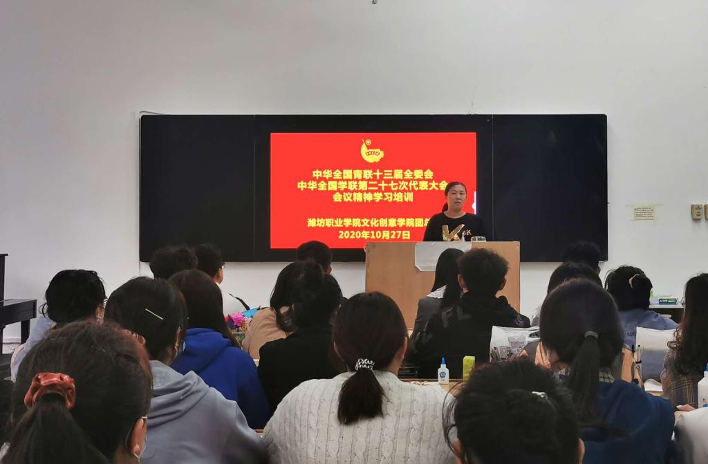 为认真学习贯彻习近平总书记致全国青联十三届全委会、全国学联二十七大贺信和党中央致词精神,认真传达学习会议精神,按照团中央和团省委的安排部署,10月27日下午,文化创意学院组织学团干部在16号楼开展全国青联十三届全委会和全国学联二十七大会议精神学习培训。