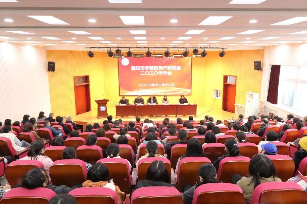 12月12日,潍坊市学前教育产教联盟2020年年会在学院奎文校区大学生创业中心报告厅举行。山东省教育厅基础教育处副处长、中国学前教育研究会事业发展与管理专业委员会副主任王春英,济南幼儿师范高等专科学校校长、山东省职业院校教育类专业教学指导委员会常务副主任委员李海平,潍坊市教育局一级调研员李端梅,联盟理事长、学院院长王家爱,联盟秘书长、副院长贺志强等出席,联盟理事长、副理事长单位、部分理事单位以及学院学前教育专业师生代表共160余人参加了会议。会议由贺志强主持。