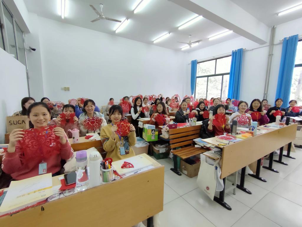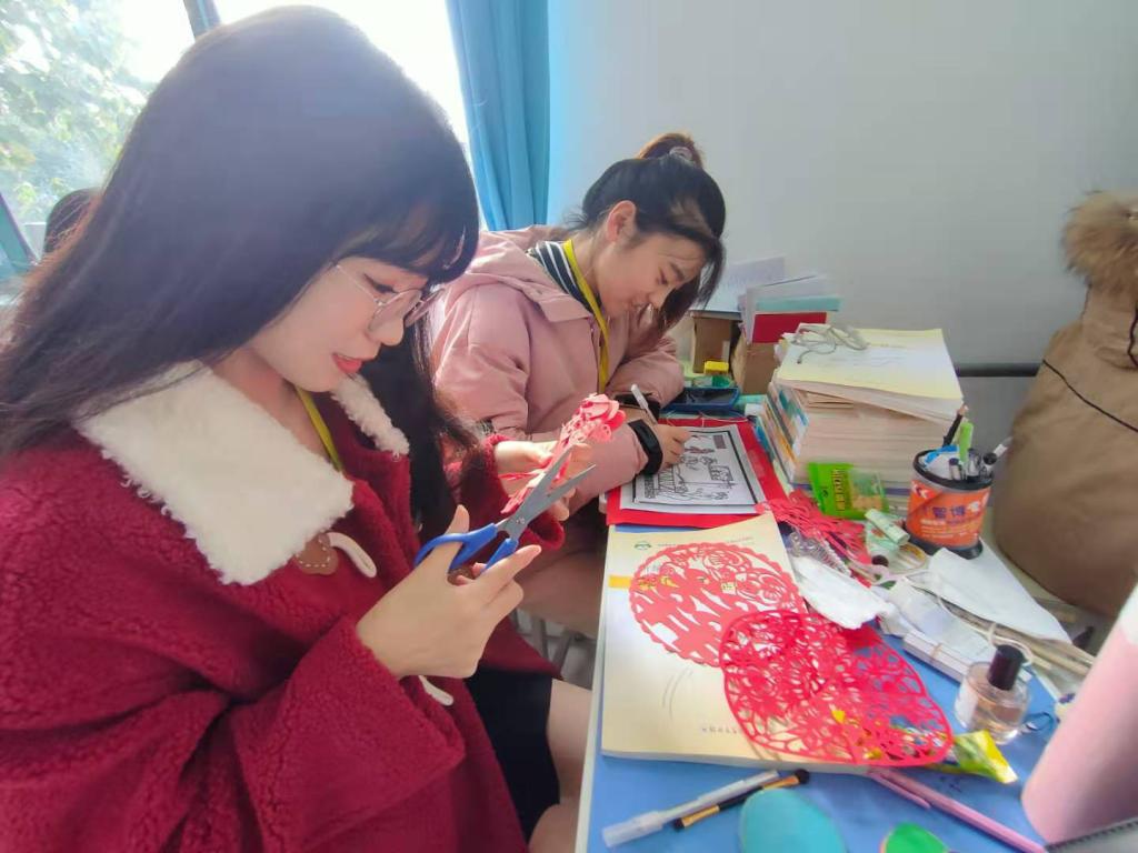 剪纸是世界十大文化遗产之一,美化生活、陶冶情操,提升审美能力,丰富校园文化,是校园美育的有效途径。为更好地传承剪纸技艺,民间技艺传承基地剪纸工作室团队成员,学习传统,不断创新,剪纸技艺不断提升。为弘扬优秀民族文化,剪纸工作室团队成员把剪纸艺术推进了学院课堂,通过示范、交流等形式带动广大学生投入到剪纸学习活动中,在课堂学习活动中,同学们追溯剪纸文化历史,了解当下蓬勃发展的艺术活力,熟悉剪纸艺术特点,掌握了剪纸技法规律,提升了剪纸技艺技能。