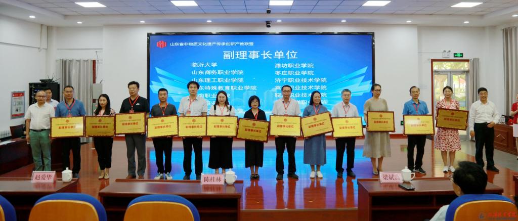 本次年会由临沂职业学院承办,山东省教育厅、山东省职教学会、全国非遗职业教育集团等相关领导、专家莅临活动现场指导。首先进行了临沂市2021年“文化和自然遗产日”暨第七届优秀传统文化进校园活动启动仪式。随后举办了2021年山东省非物质文化遗产传承创新产教联盟年会暨职业院校非遗文化教育发展论坛。我校作为副理事长单位由与会领导授牌。