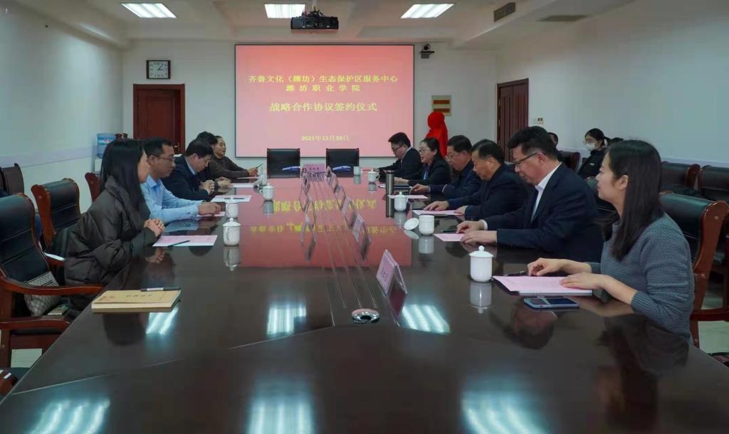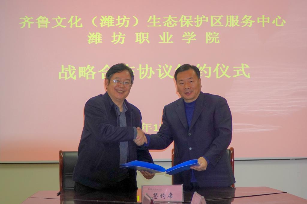 齐鲁文化(潍坊)生态保护区服务中心是国内首个以国家级文化生态保护区命名的公共文化服务机构。本着“资源共享、优势互补、注重实效、共谋发展”的原则,我院与齐鲁文化(潍坊)生态保护区服务中心签署战略合作协议,今后双方将在科学研究、人才交流、业务合作、实习实训等方面建立战略性、紧密型合作关系,实现人才、技术、资源的共享与互动,开展全方位的合作,进一步弘扬优秀传统文化、培养文化艺术人才、搭建实践交流平台、助力全民艺术普及、满足人民群众多元化精神文化需求,服务潍坊经济社会高质量发展。(曾宪超 邱文彦供稿)