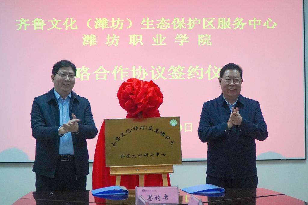 仪式上,与会人员进行了座谈交流,共同收看了齐鲁文化(潍坊)生态保护区服务中心和潍坊职业学院宣传片。田义明、桑福岭为“齐鲁文化(潍坊)非遗文创研究中心”揭牌。高增光、贺志强代表双方单位签署战略合作协议。