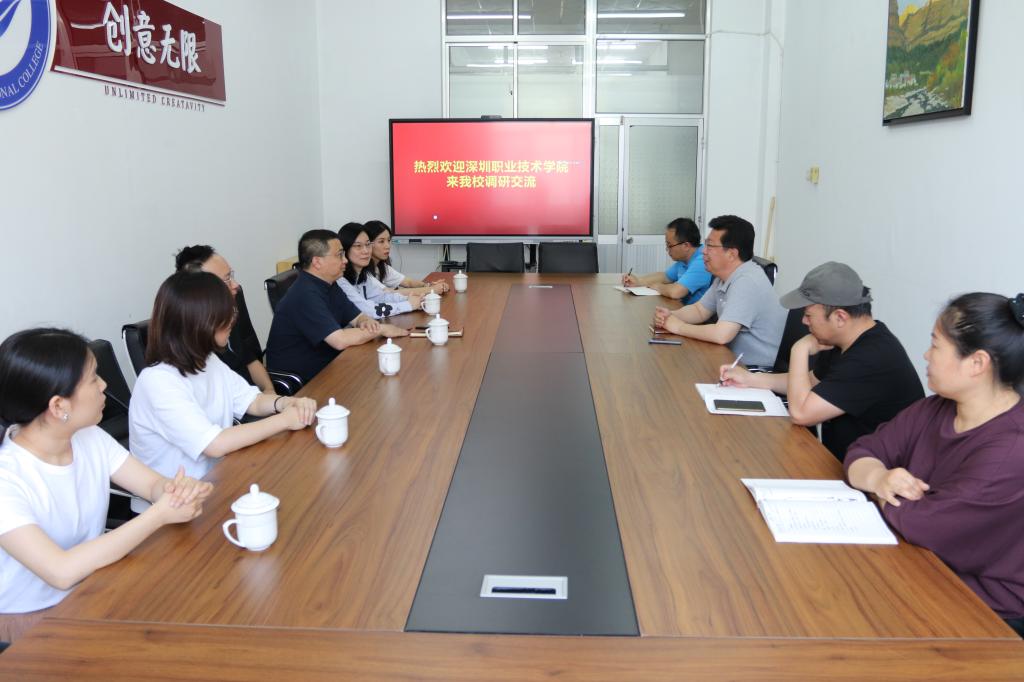 深圳职业技术学院一行首先参观了专业实训室和楼宇文化建设,随后进行了交流座谈。文化创意学院主要负责同志对深圳职业技术学院一行到来表示热烈欢迎,他介绍了学校办学历史、基本情况、“双高/职教高地”建设、近年来发展建设取得的成绩,随后介绍了文化创意学院专业设置、师资队伍、技能大赛、校企合作等办学基本情况。帅斌介绍了深圳职业技术学院艺术设计学院的专业建设、教学科研、校企合作项目及国际化成果等。