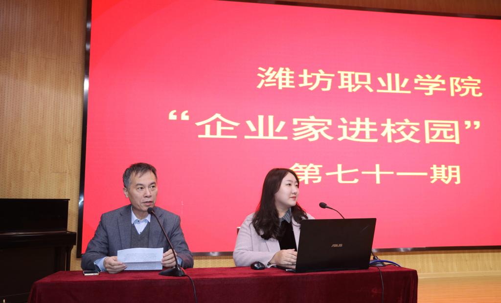 12月19日下午,学院第七十一次“企业家进校园”活动在奎文校区16号楼报告厅举行,潍坊奎文门文化运营管理有限公司总经理、潍坊潍物文化传播有限公司运营总监欧阳,作了主题为“文创,是艺术,也是生活”的讲座。文化创意学院师生300余人参加了报告会。
