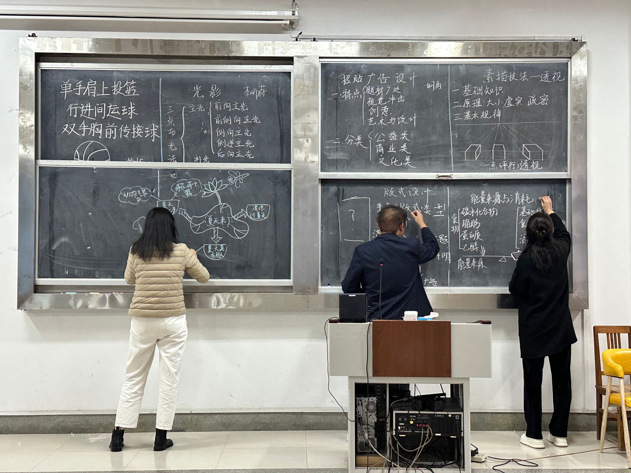 比赛过程中,教师们准备充分,将粉笔字板书与教学内容相融合,展现出文化创意学院教师队伍的专业素养和扎实的基本功。青年教师们更是全身心投入,有的以细腻的笔触勾勒出知识的脉络,有的则以独特视角解读教材,使枯燥的知识点变得生动有趣。一幅幅规范、美观且富有创意的板书作品让人眼前一亮。评委们综合考量书写规范、版面设计、内容创意等多个方面,最终推选出3名教师参加校赛。