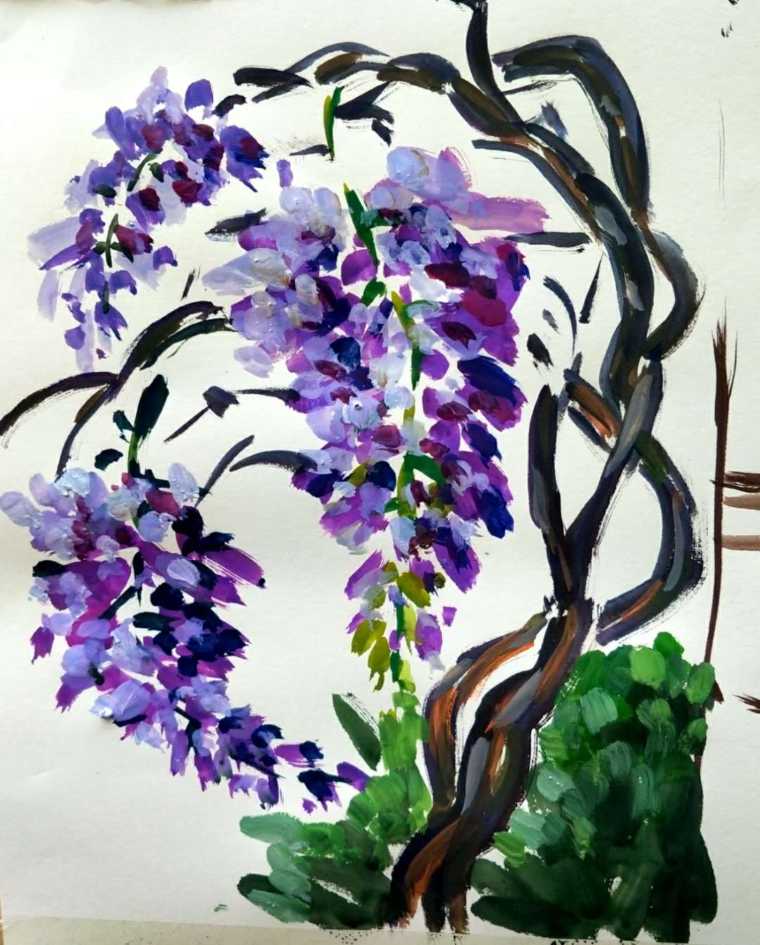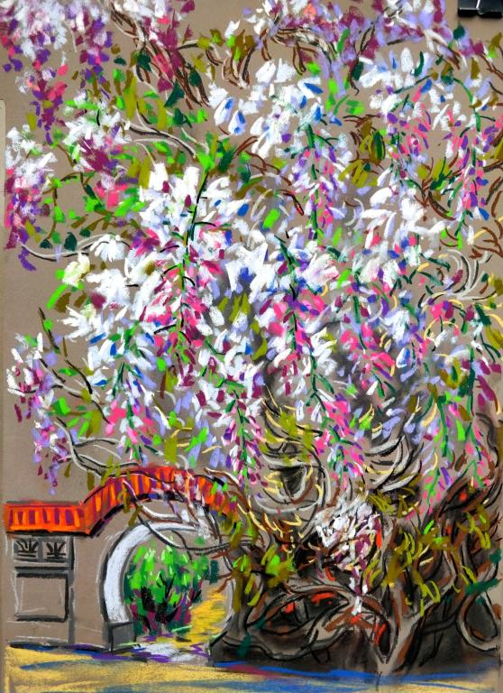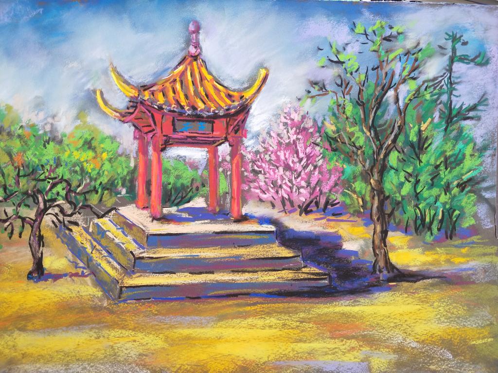 四月天的校园春景激发了同学们极大的创作热情,大家争先恐后地选景进行绘画。竞芳亭畔、藤萝架前、雪松树下都是架起画架的最佳地点。林荫小道、庭院建筑、四月繁花跃然纸上,每一幅作品都蕴含着浓浓的人文气息。指导老师王老师耐心地为同学们提供示范和讲解,课堂在师生其乐融融的氛围中进行。