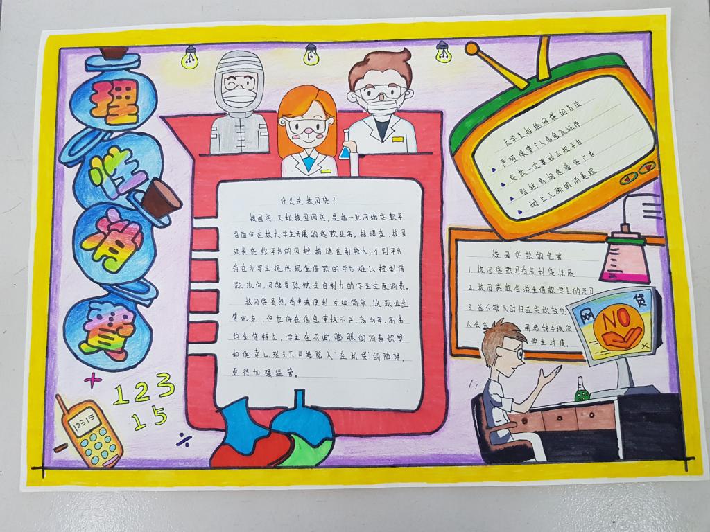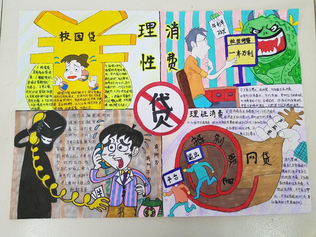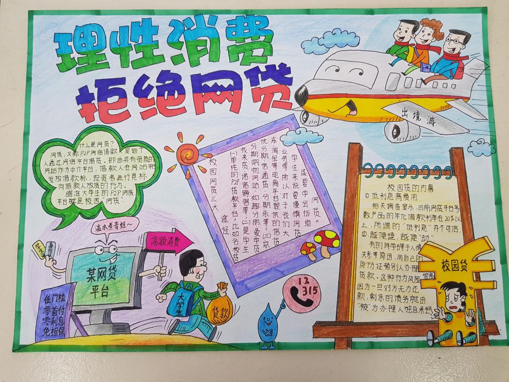 同学们围绕“理性消费,安全拒绝网贷”主题,认真搜集资料,深入了解校园网贷及其危害,加强了对网上贷款的警惕,拒绝网贷、防止受骗,通过制作图文并茂的手抄报,提高了自身的安全意识。各班还组织了安全教育主题班会,分享和讨论了相关典型案例,引导同学们树立正确的消费观,理性消费,适度消费,谨防网络诈骗。