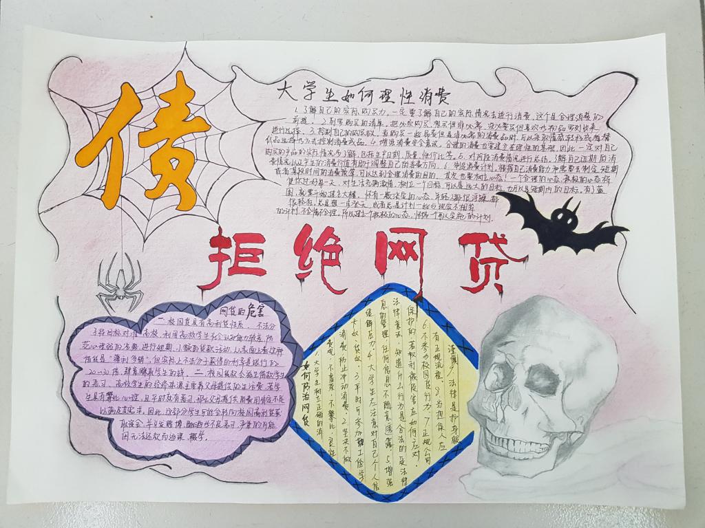同学们广泛收集关于校园网贷资料,精心设计海报版面,惟妙惟肖的绘制出因网贷所引起的一系列矛盾和危害。作品主题鲜明,构思独特,配文直观警醒。通过直观的案例讲解、法律知识说明、网络购物陷阱提示等全方面地介绍网贷产生的危害,让同学们对网络贷款有了进一步的认识,引导同学们理性消费。此次比赛最终评选出一等奖三名,二等奖五名,三等奖六名和优秀奖八名。