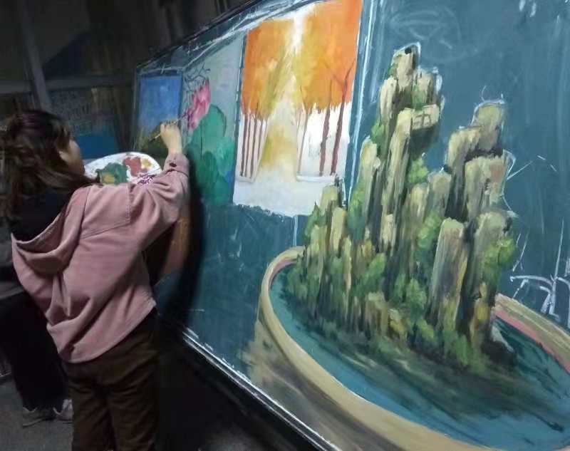 过程中,学生们根据校园四季场景,认真构图,用心配色。在大家的共同努力下,勾勒出春日的百卉千葩、夏时的碧叶亭亭,描绘出阳光下的秋叶飘飘,冬日里的松青雪白。用画笔展现了学校一年四季的美丽风光。