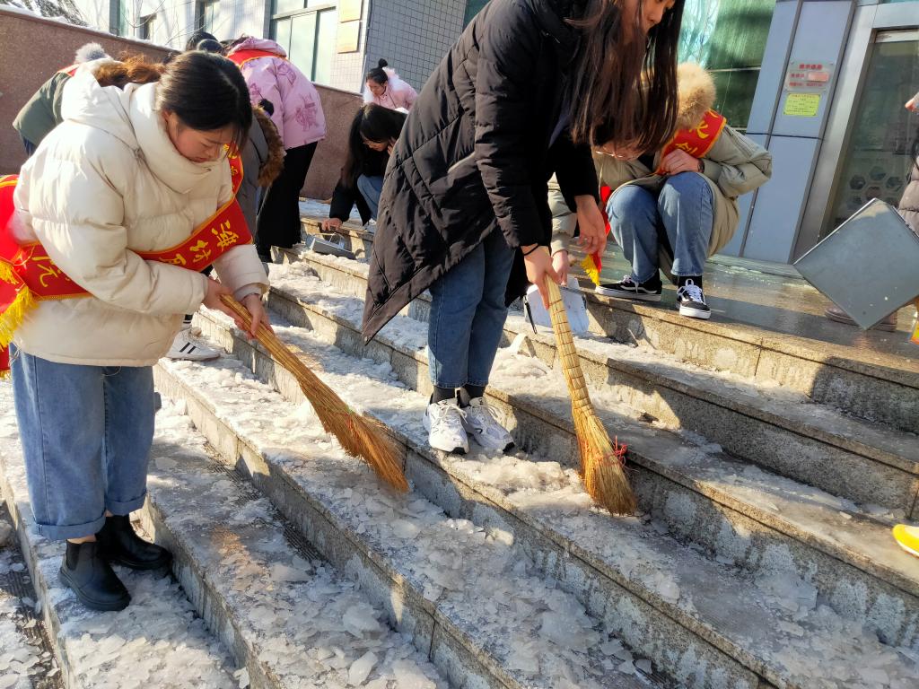 寒风凛冽,但阻挡不住同学们的扫雪热情,校园各角落遍布着广大学生志愿者的忙碌身影,大家热情高涨,积极投入到清理积雪的“战斗”中。清扫积雪过程中,同学们干劲十足,齐心协力,用扫帚、铁锹等工具对路面积雪进行清扫。经过半天的清扫,教学楼前以及校园主干道路面积雪都被清理得干干净净,为师生、车辆行走提供了安全保障。