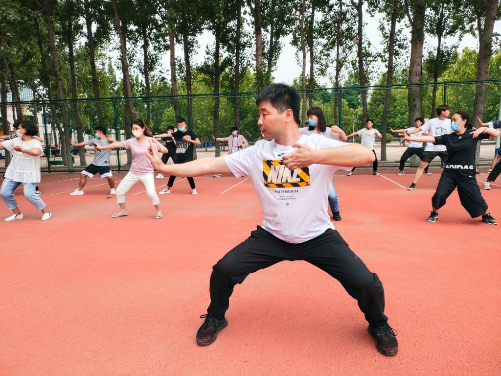 活动伊始,指导老师向同学们讲解了八段锦的相关知识,八段锦健身功法是国家体育总局推广的全民健身功法之一,是中华民族传统体育项目。此套健身操动作舒展,简单易学,由八种如“锦”缎般优美、柔顺的动作组成,在现代养生保健生活中具有独特的作用。接下来,指导老师带领学生进行现场教学,整套健身动作柔和连绵,滑利流畅,同学们认真学习并进行初步练习。随后,在学生的自我练习环节,指导老师认真观察并及时示范指导了学生的动作。