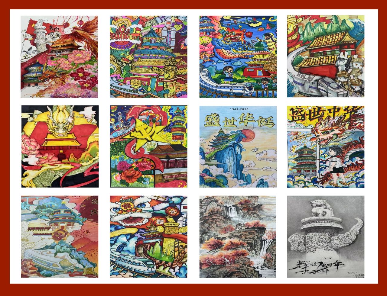 活动一经推出,便得到了同学们的积极响应。大家纷纷拿起画笔,以饱满的热情投入到创作之中。他们以独特的视角、丰富的色彩和细腻的笔触,描绘出祖国的壮丽山河、悠久历史、灿烂文化以及新时代的伟大成就。征集作品类型丰富多样,涵盖国画、油画、素描、版画等门类,不仅展现了同学们扎实的绘画功底,更表达了他们对祖国深深的热爱之情。比赛最终评选出一等奖3名、二等奖5名、三等奖8名、优秀奖10名。