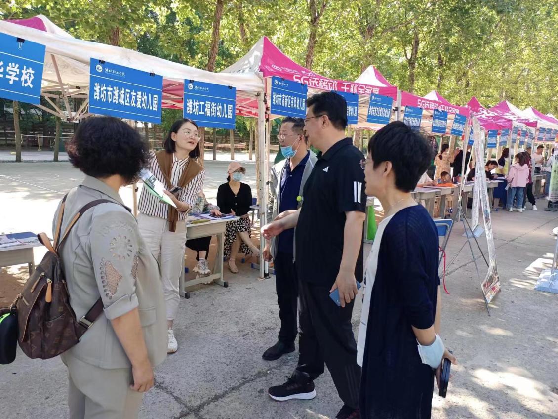 本次招聘会共有潍坊工福街幼儿园、文华自然幼儿园、山东好希望教育科技有限责任公司、潍坊康瑞体育产业股份有限公司、潍坊喜鹊装饰工程有限公司等60余家企业入驻参会,提供岗位1000余个,包括学前教育、设计、体育教练、人物形象设计等多个专业方向,充分保障了学生多元化实习就业岗位需求。招聘活动中,学生们满怀热情参与活动,手持精心准备好的自荐书和简历,积极与用人单位交流。企业代表详细认真介绍企业基本情况,解答学生疑难问题。文化创意学院教师到现场了解社会及行业的招聘需求与学生求职意向,听取用人单位对学校人才培养、就业服务的意见与建议。